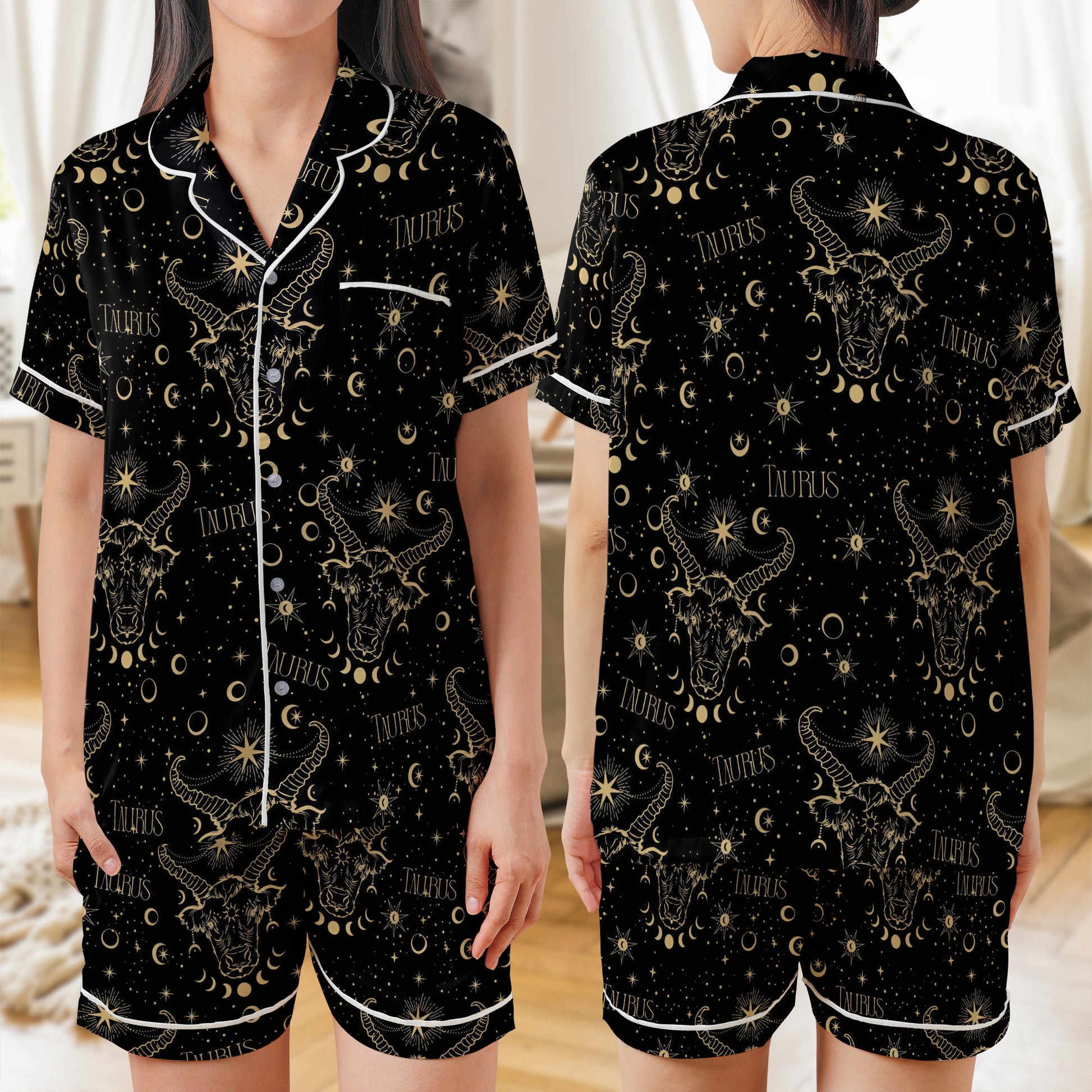 Taurus Zodiac Star Seamless AOP Satin Short-Sleeve Pajamas Set