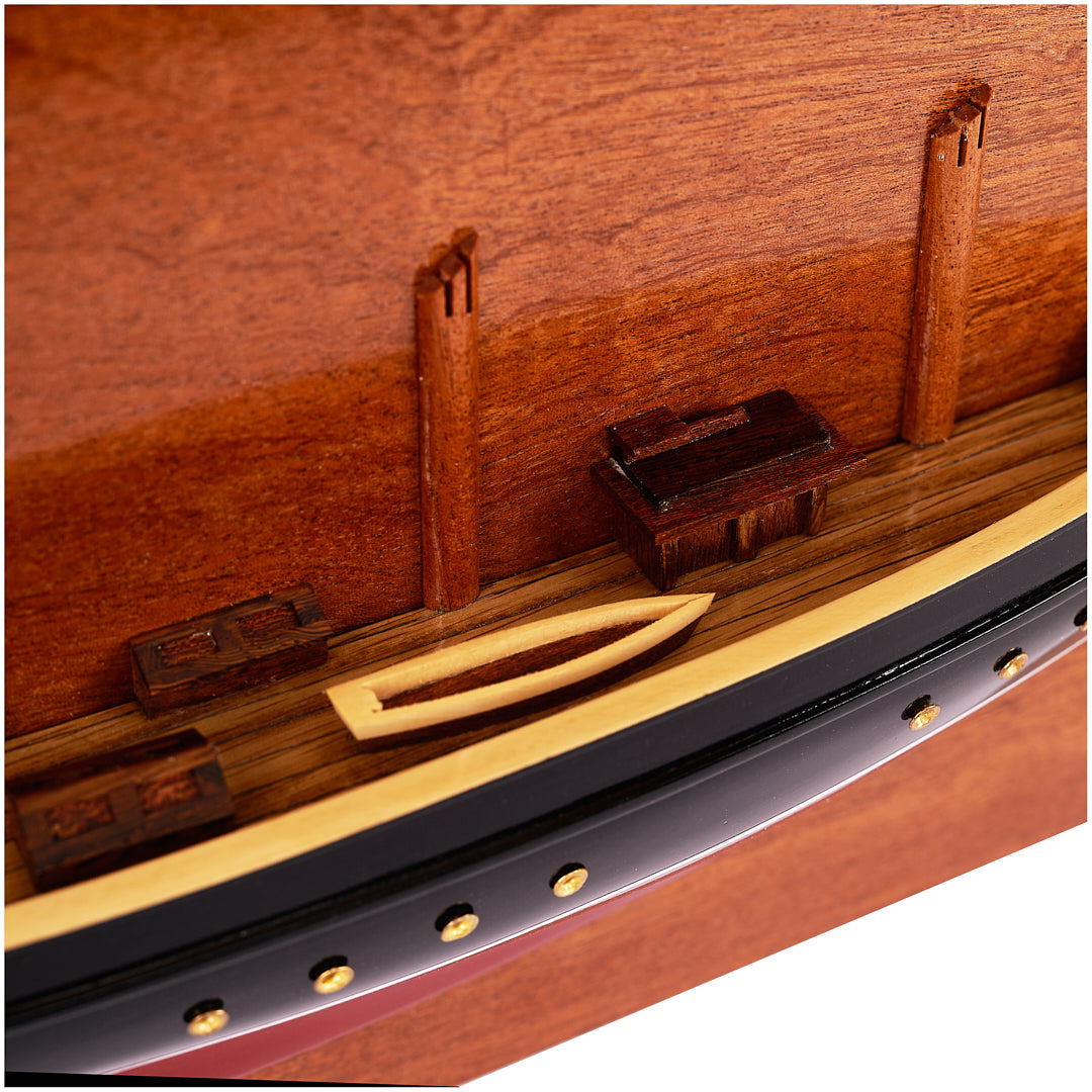 Each detail of this model ship has been carefully shaped by hand, reflecting the artisans' dedication and passion for their craft. The wooden hull, crafted with precision, mirrors the graceful lines and contours of a real ship, showcasing the artistry and skill involved in its creation.