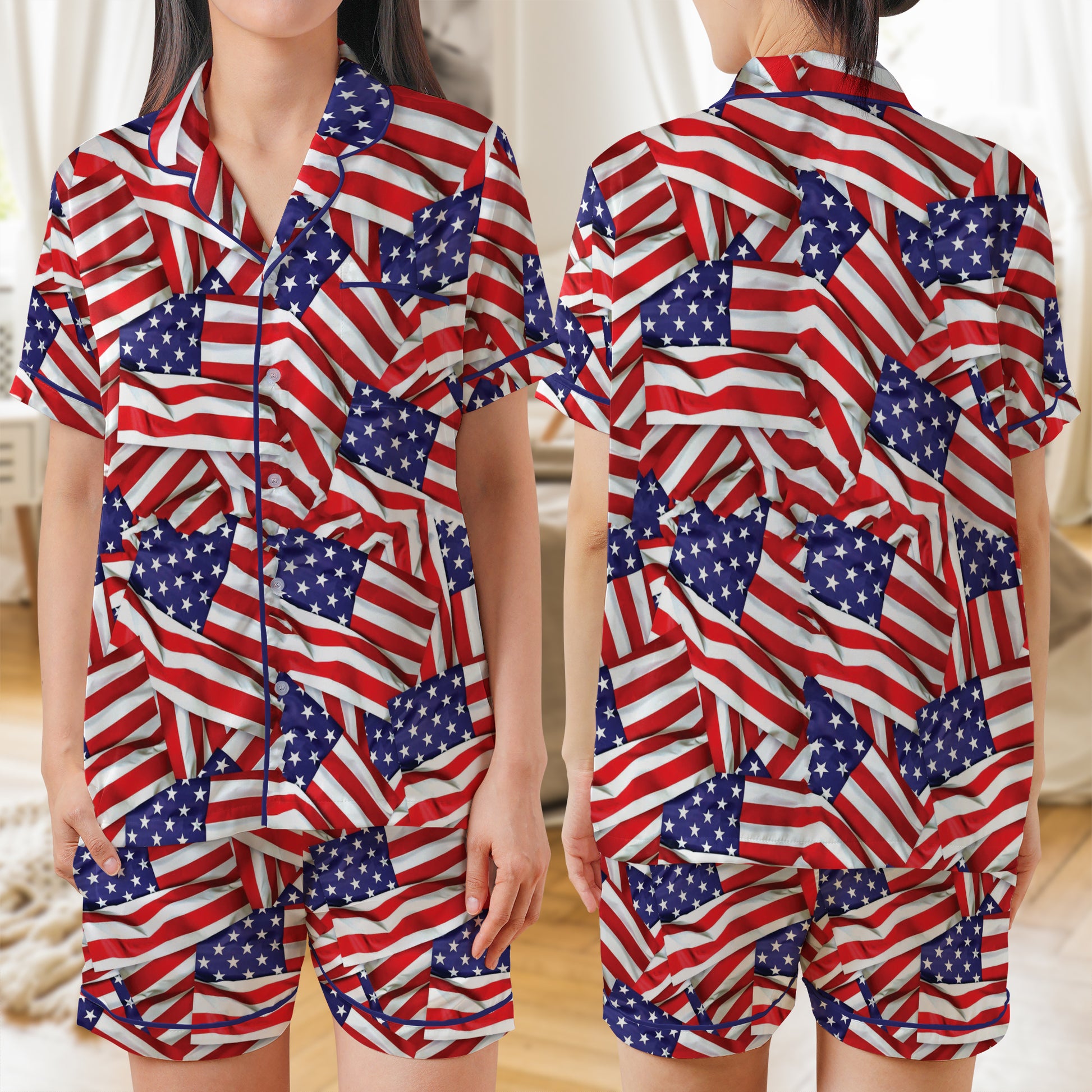 US American Flag AOP Satin Short-Sleeve Pajamas Set